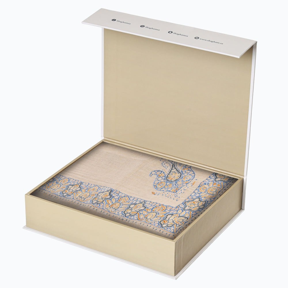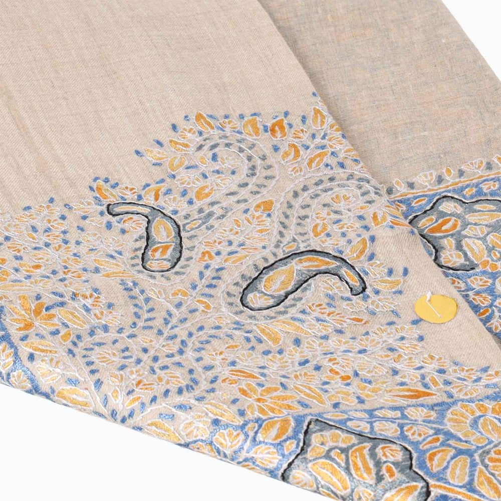 شال صوف كشميري باشمينا VIP ارضية لون بيج مطرز يدوياً بشكل مميز بتداخل جميل بين اللون الازرق والاصفر